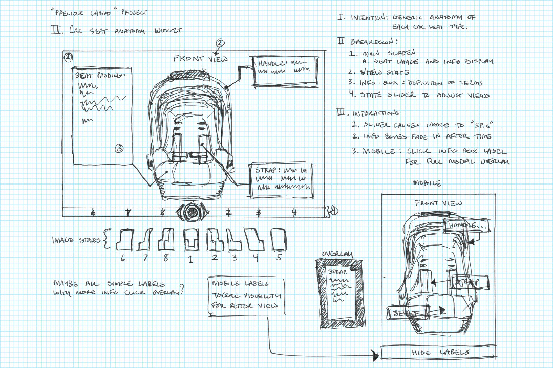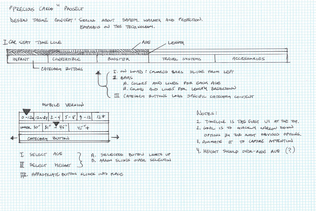 Early sketches focused on educating parents about age ranges while doubling as navigation. The concept offered a quick way to jump to the right seat type without overwhelming first-time buyers.