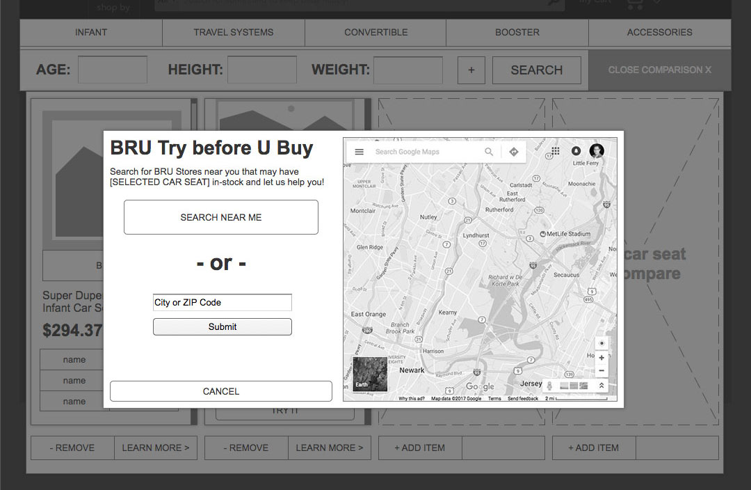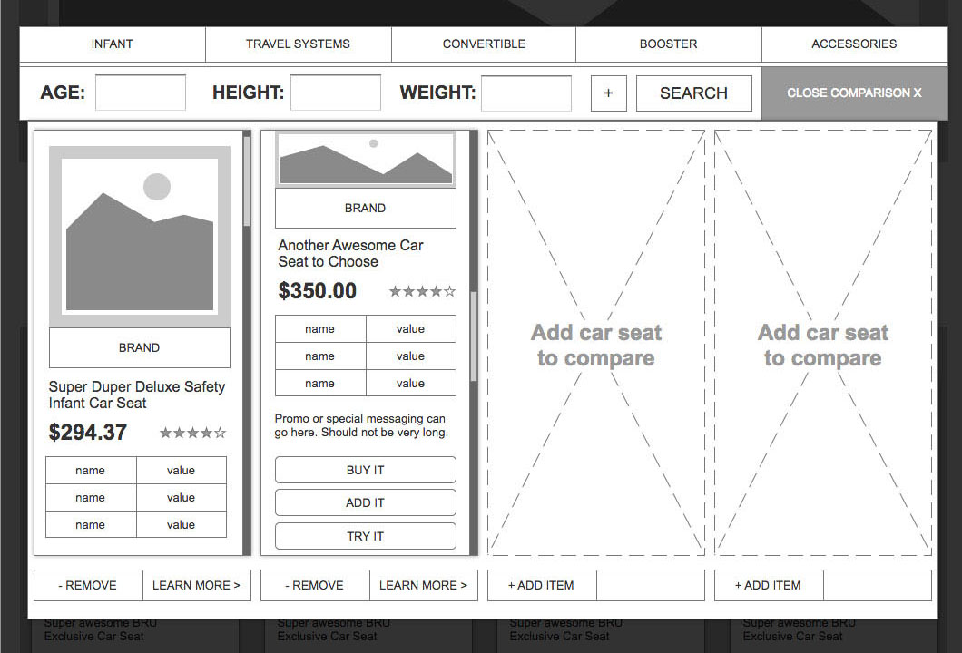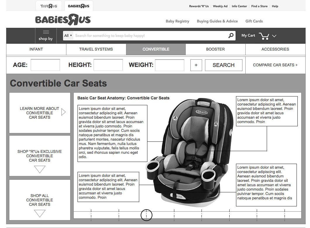 The wireframe framed the full-page experience, balancing education with product results. Filters prioritized the essentials—child age and weight—so shoppers could quickly narrow down compatible seats.