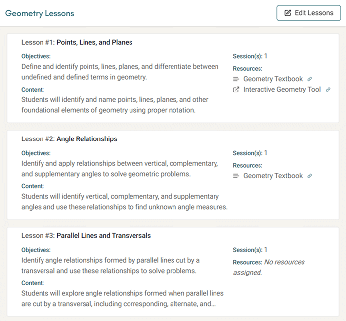 Created a reusable lesson library that stores unit studies, resources, and assessments. Parents can assign the same lesson to multiple children, then personalize pacing and mastery per student.